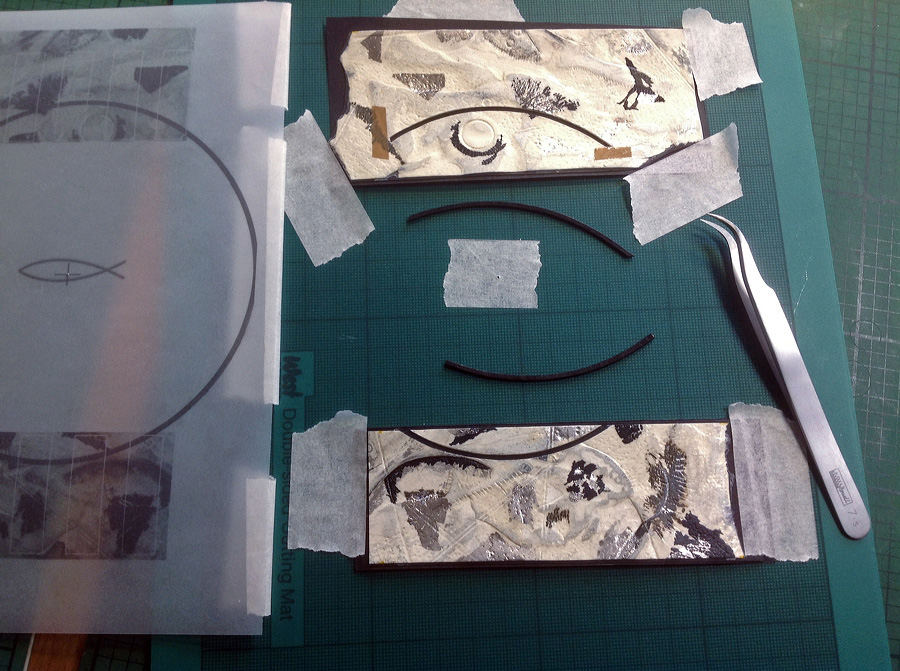 Raised black and white leather 'arcs' inserted into the lacunose.