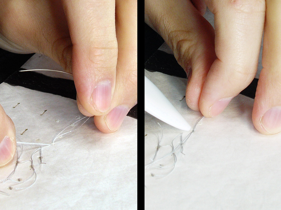 The thread was tied and glued into the recesses.