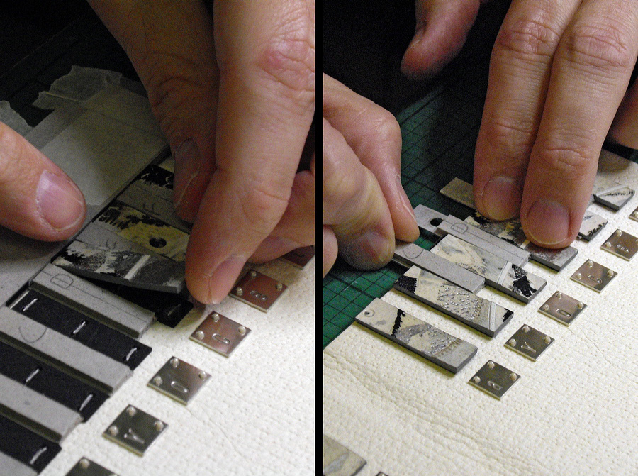 Placing the lacunose uppers using a jig, which, as the bases are 0.75mm smaller all round, had to be carefully slid out.