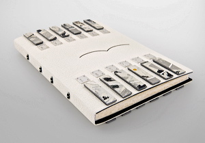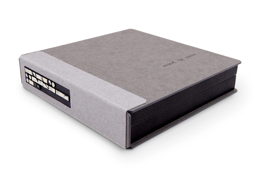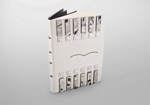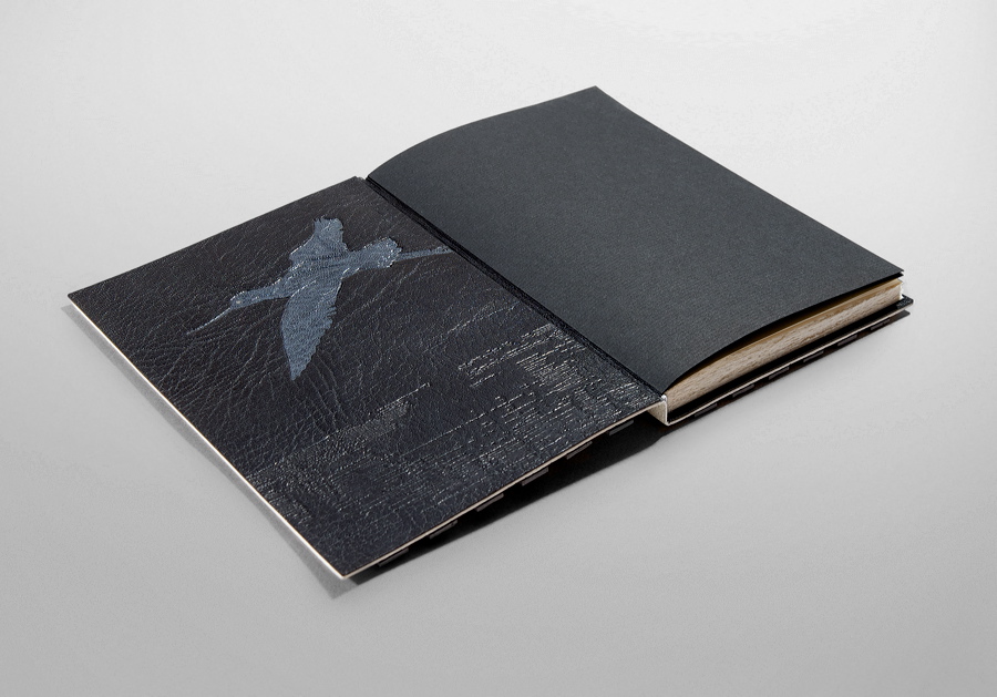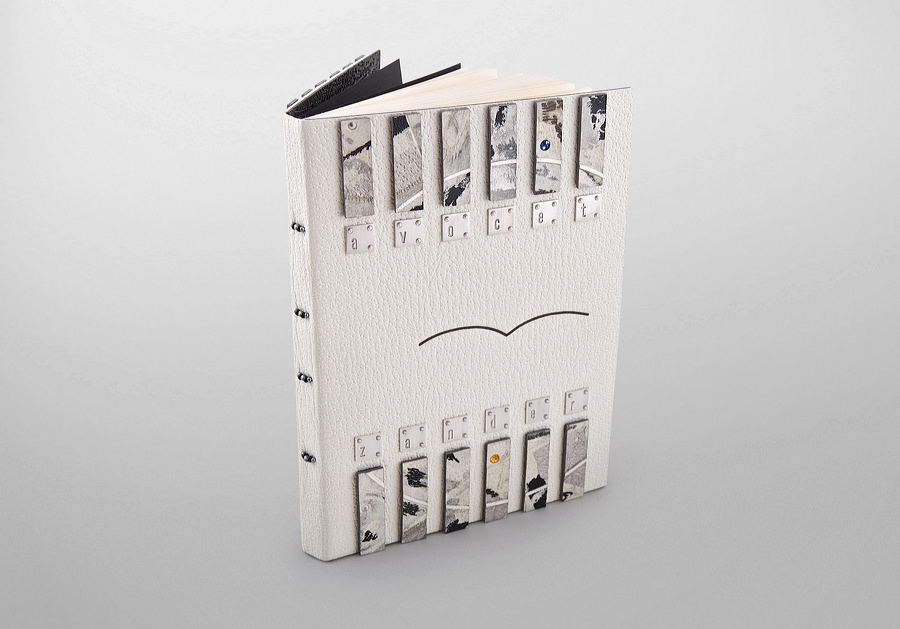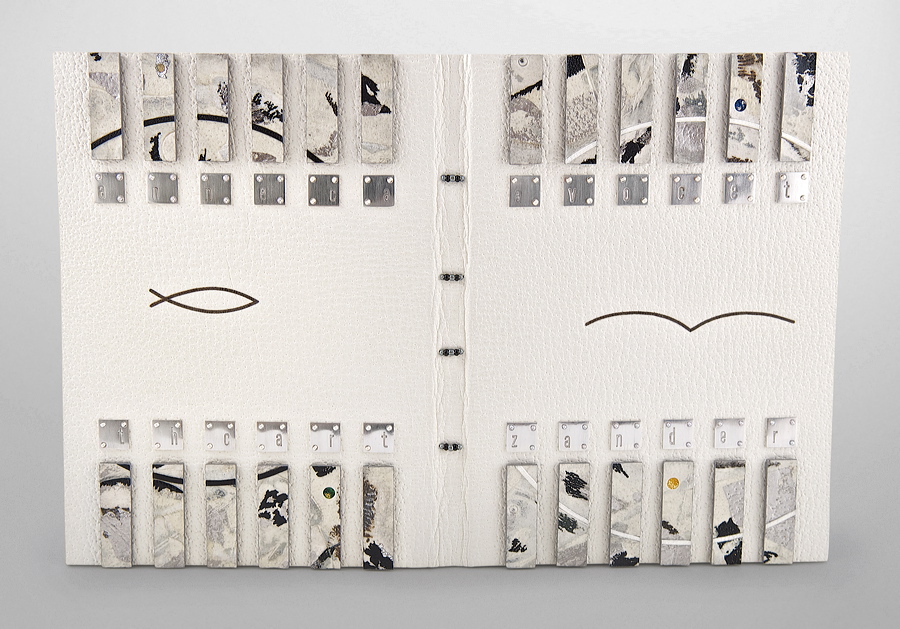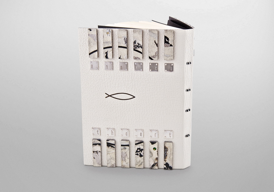 Raised 'lacunose' panels (PVA-impregnated/sanded leather collage). Title (front) and author's name (rear) debossed in squares of silver attached with sewn glass beads. |