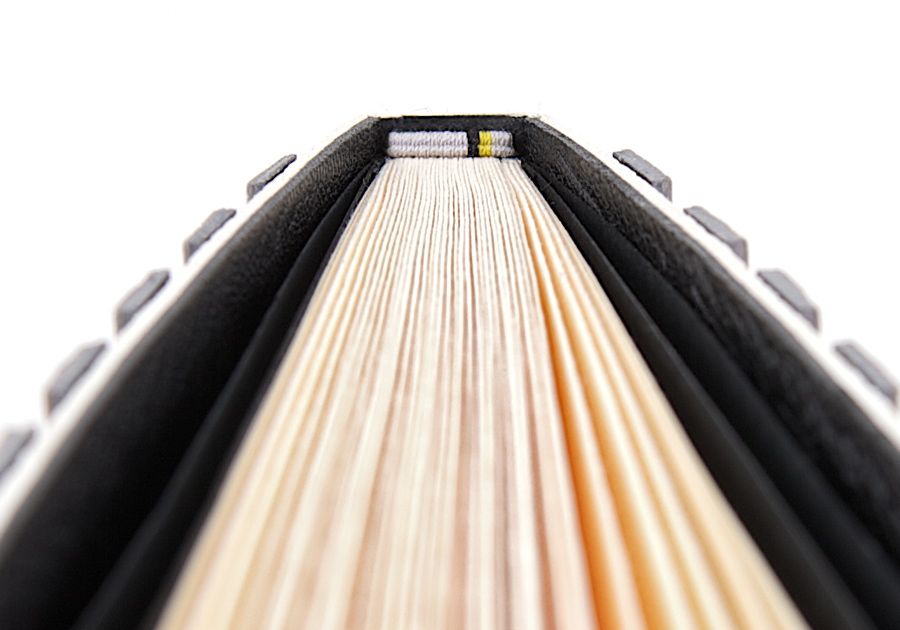 Two-stage sewing; first stage, textblock only; second stage through cover and glass beads. |
