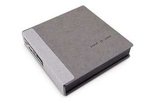 Laminated limp cover of Hewits alum tawed goat with pigskin embossed grain (outer) and black Harmatan goat (inner). |