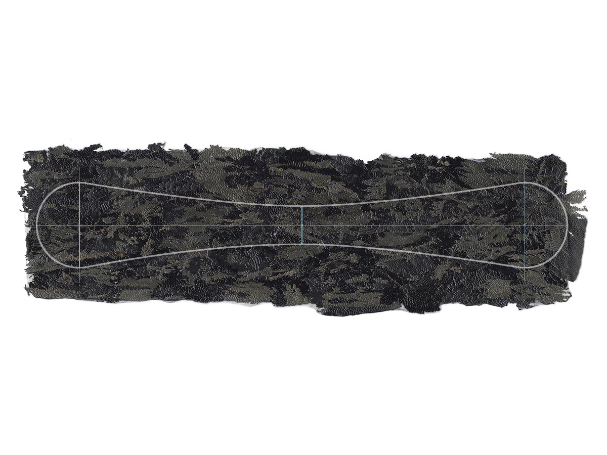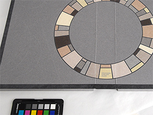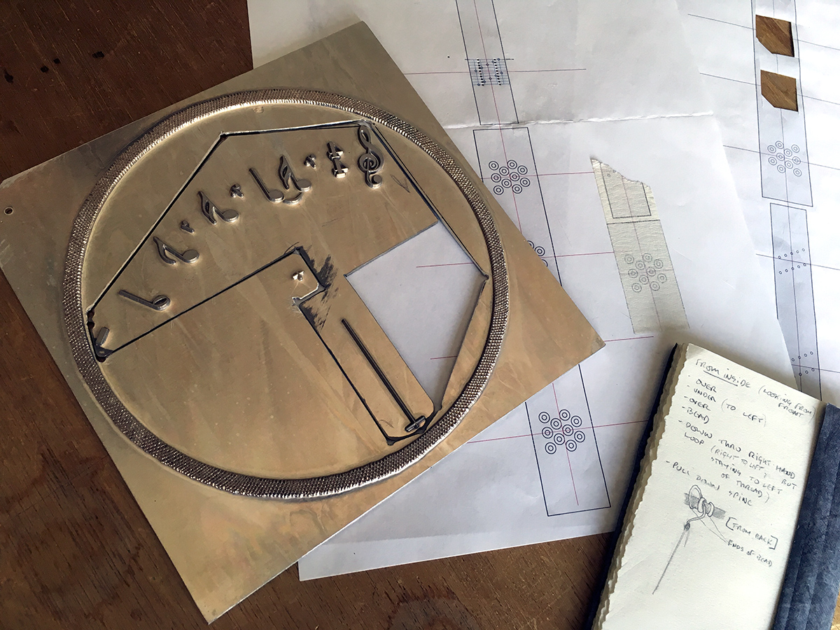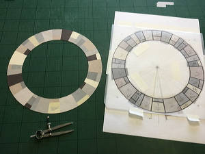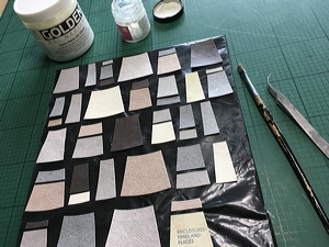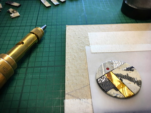 Preparing a palette of monochrome feathered parings for the lacunose strap. Note original design printout. |