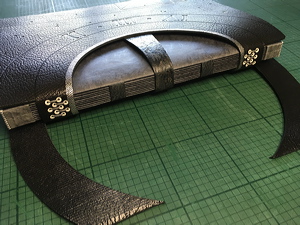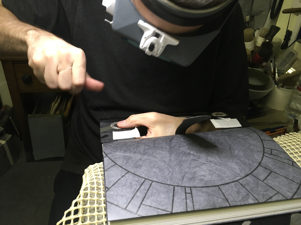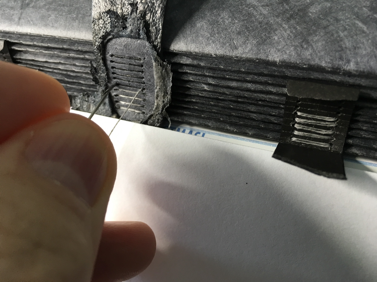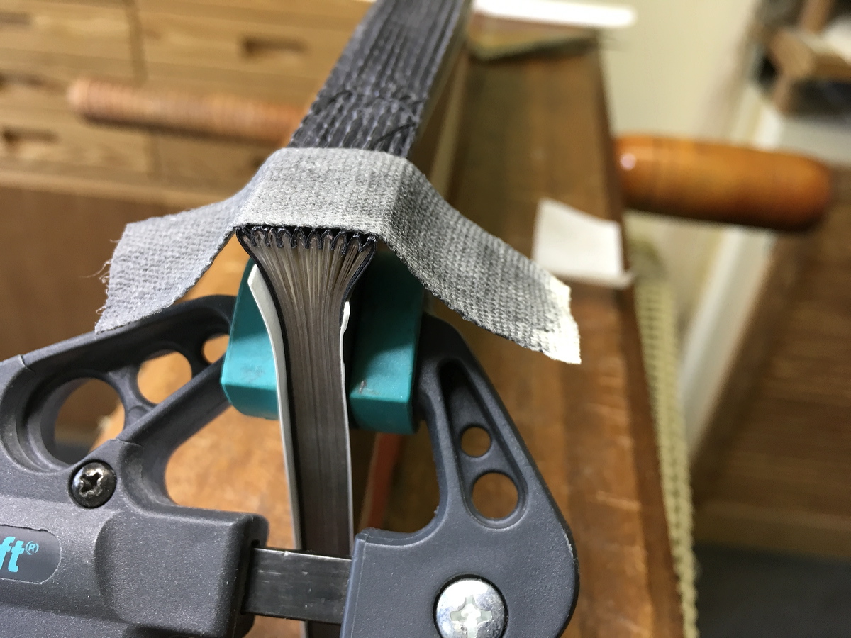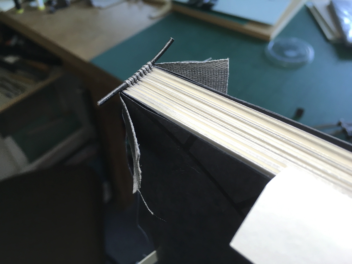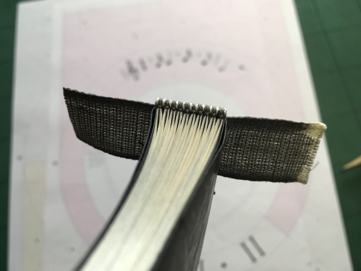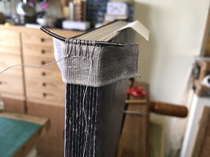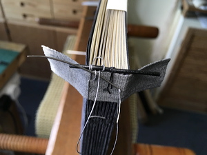 Applying dyed sewing tape over the temporarily-sewn concertina in preparation for sewing endbands. |