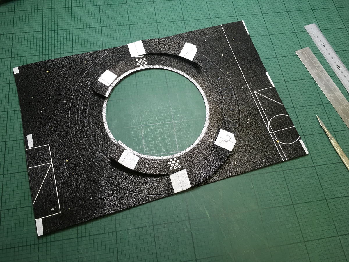 Crosshatched ring blocked in silver foil (rear cover). |