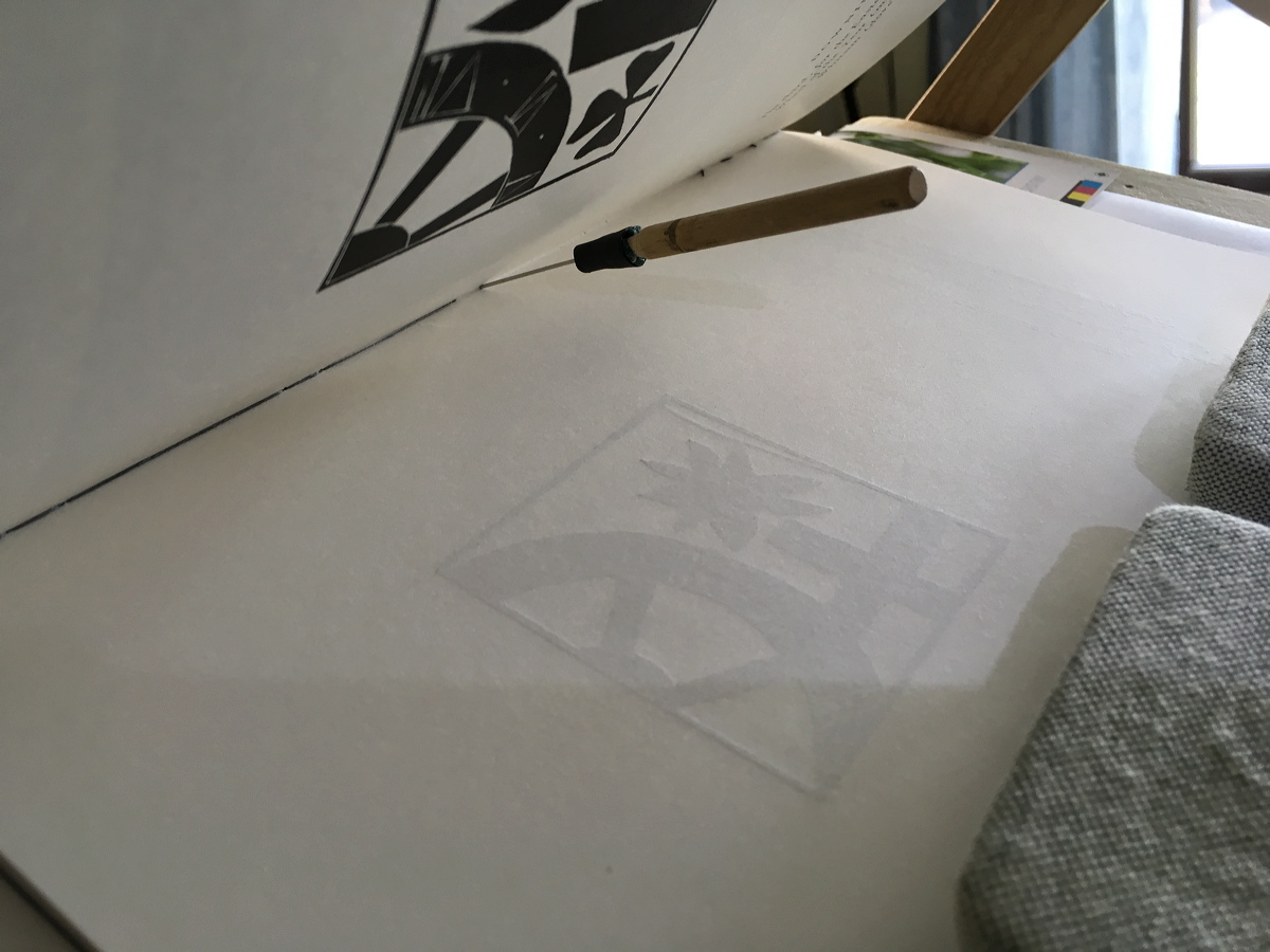 Inking stonework design on the dyed Tyvek wrapper. |