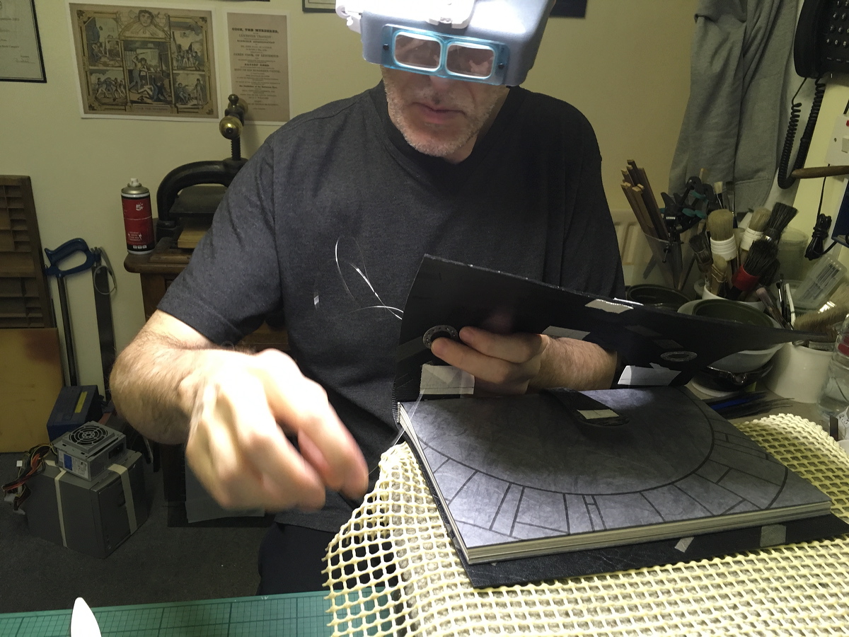 Cutting out the laminated covers. |