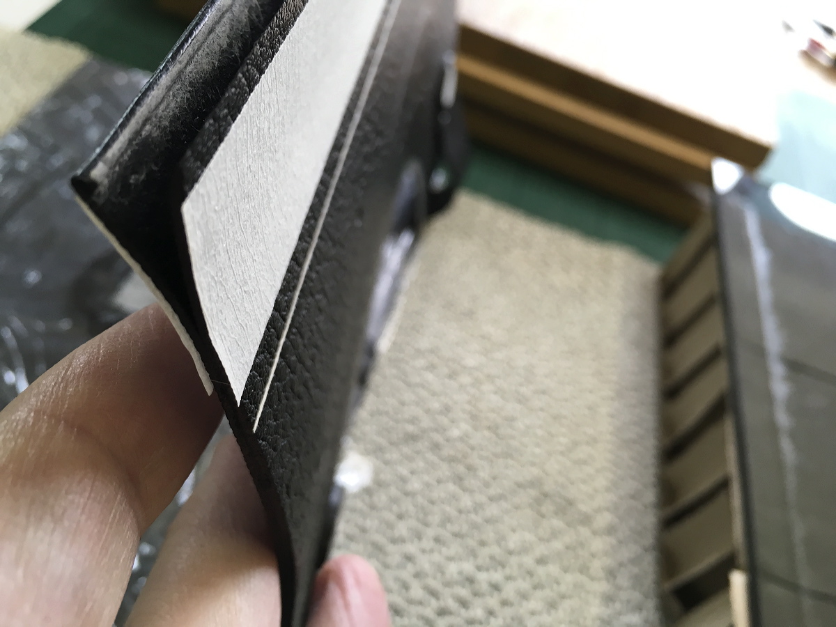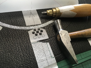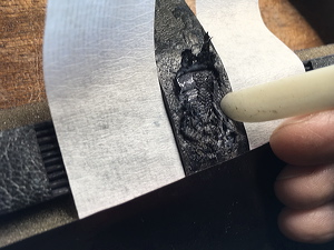 Removing the surface leather in preparation for the sewing holes. |