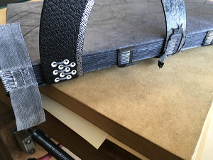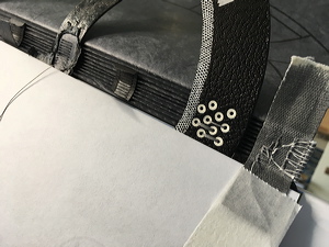 Sewing the cover straps with silver wire. |