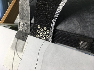 Sewing the cover straps with silver wire. Note brain switch in 'off' position during this operation. |